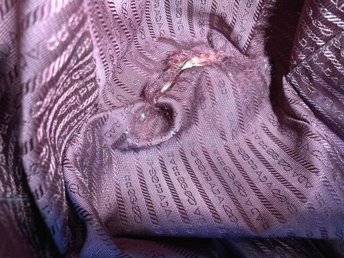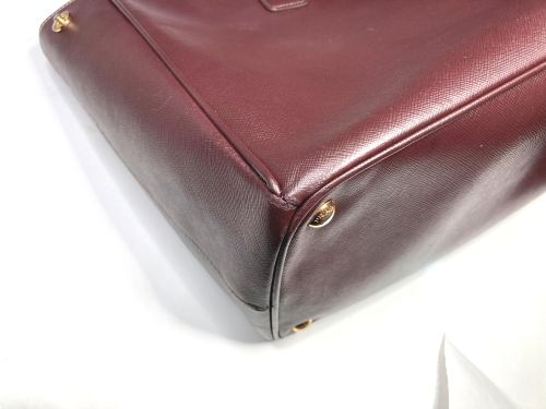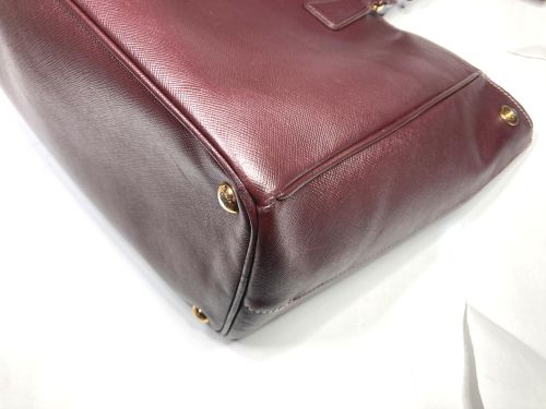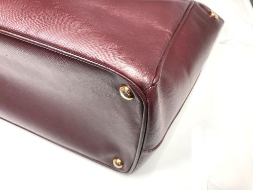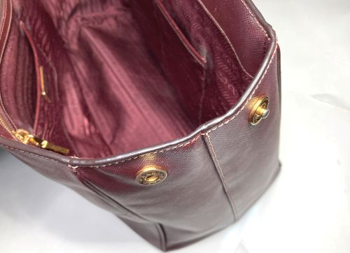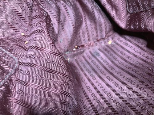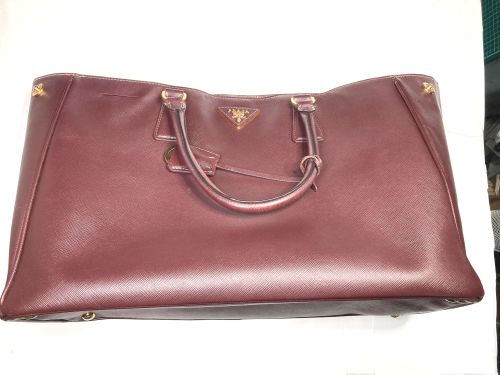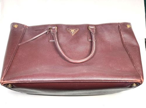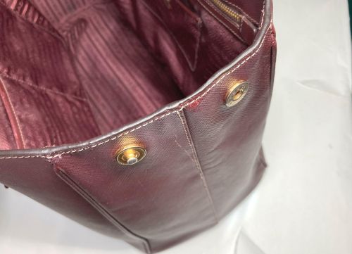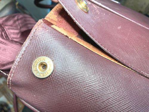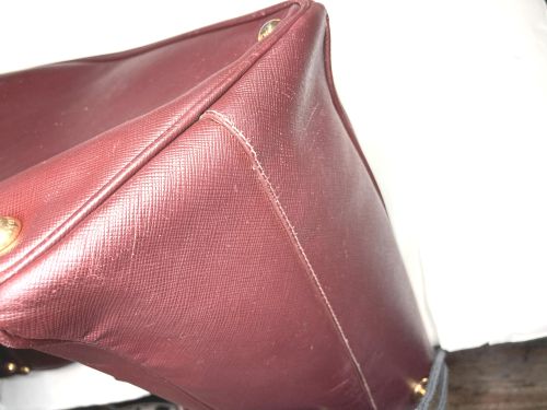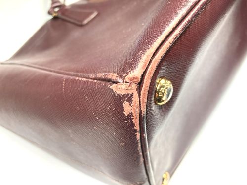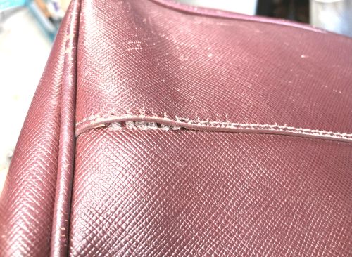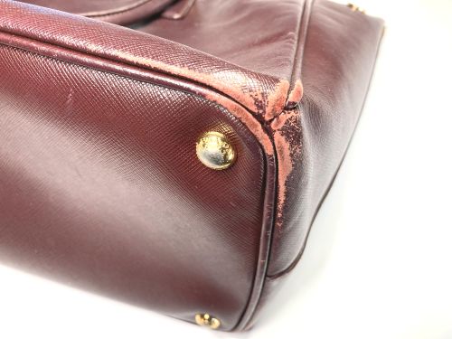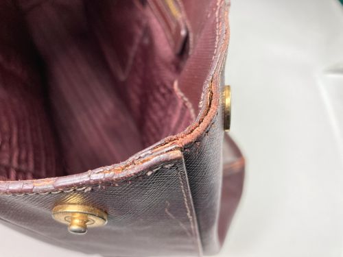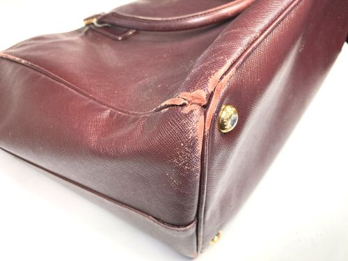 | プラダ トートバック ほつれ、コバ補修 全体的にかなり使い込んでいて、所々外糸が擦り切れてほつれまたはほつれかかって いました。また内袋委の底も縫目から裂けていました。他全体のコバの補修もご依頼で したが、こすれ傷の補修はお受けしていませんでいた。しかしながら底の擦り傷はかなり 目立っているので、こば補修のついでに軽く補色しています。白い部分がないだけでも 見栄えはかなり変わります。またチャームも千切れていたので補修しました。 |