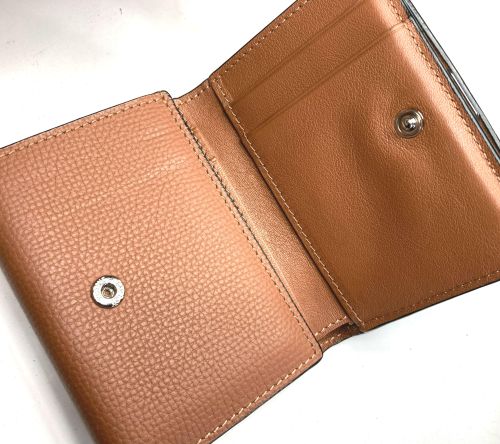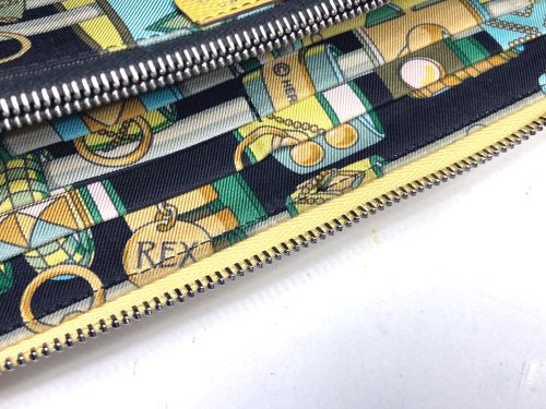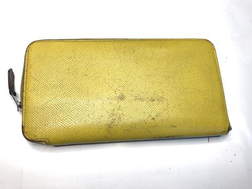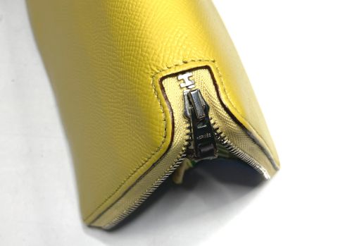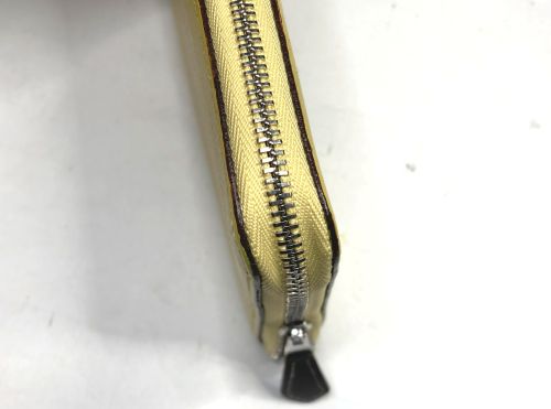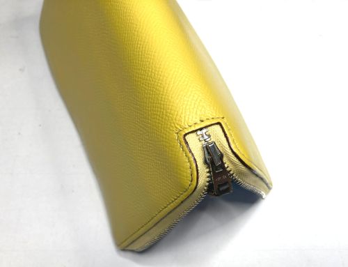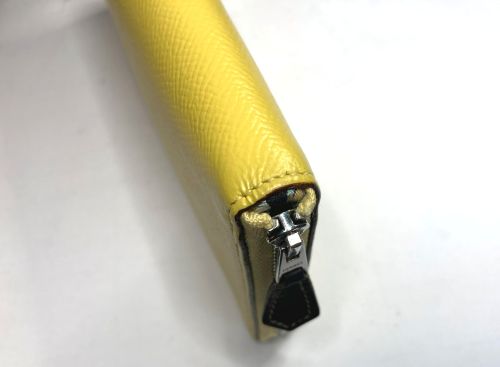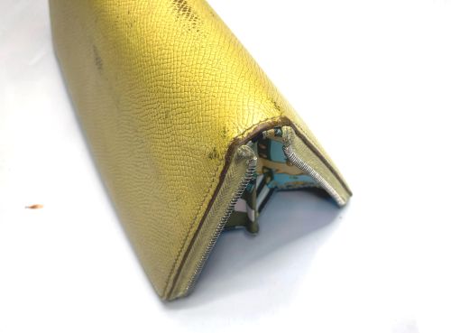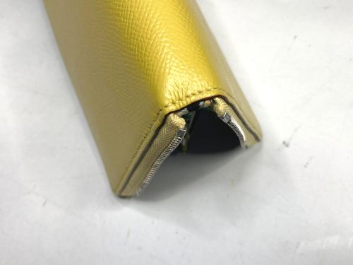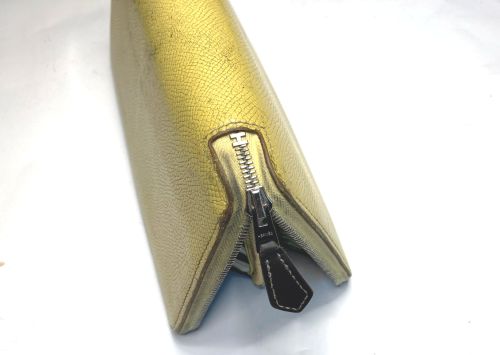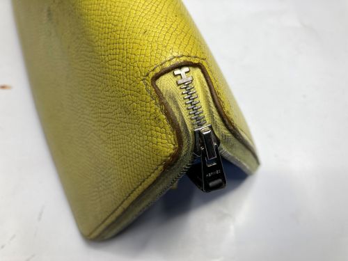 | エルメス 財布 ファスナー交換、表面補色 ファスナー布部が破れていました。YKK見本帳約600色の中からから近い色を探し取り 寄せしました。スライダーはYKKエクセラNo.3に適応しましたのでそのまま使用しま した。分解してから表面を洗剤で汚れを落としてから補色、コバを仕上げました。組立 して仕上げましたが、「H」金具は外す際に破損したのでエクセラ後ろ止め金具を加工し 取付しています。 |