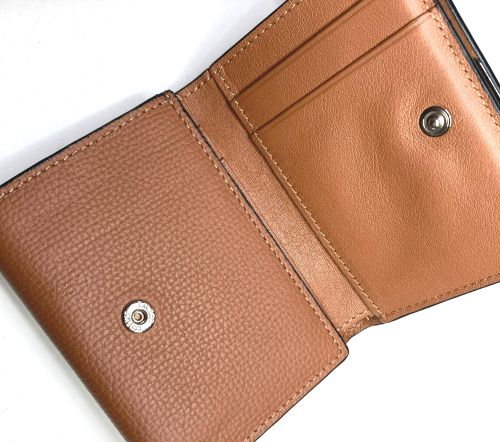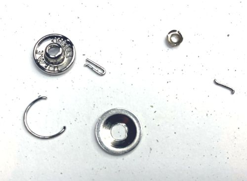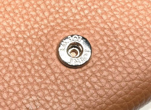 | ロエベ 財布 ホック修理 バネホックの片側のばねが破損してはめ合いが緩んでいました。コバを削って裏地を広く 開いて裏側からグラインダーでかしめ部を慎重に削ってホックを外し、互換性のある ホックのバネのみ移植して打ち直し、再縫製コバを仕上げました。裏地を開く際、芯材の 接着部が多く剥がすのに苦労しました。 |