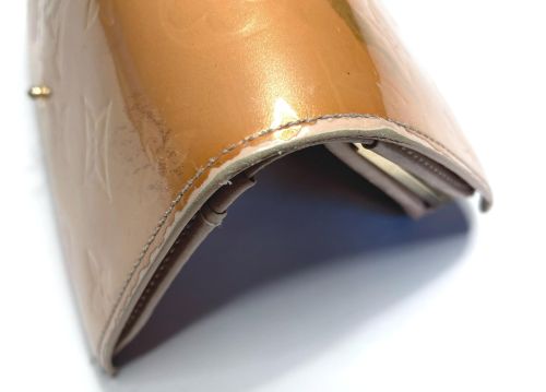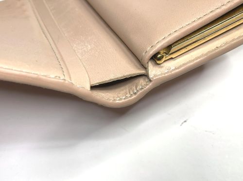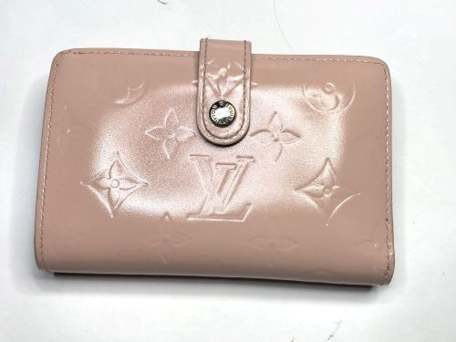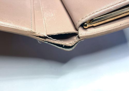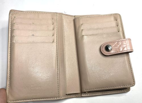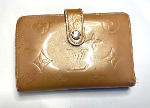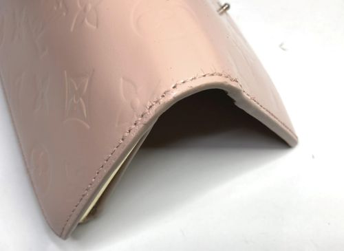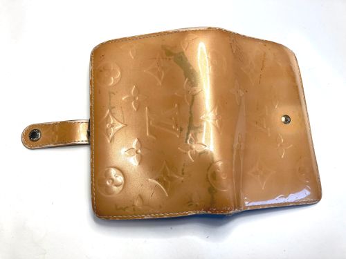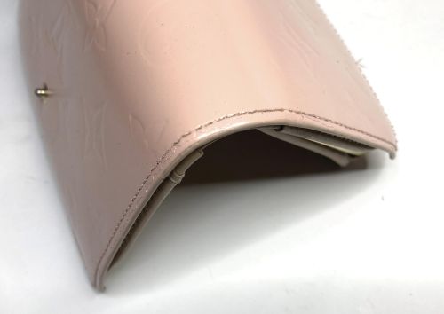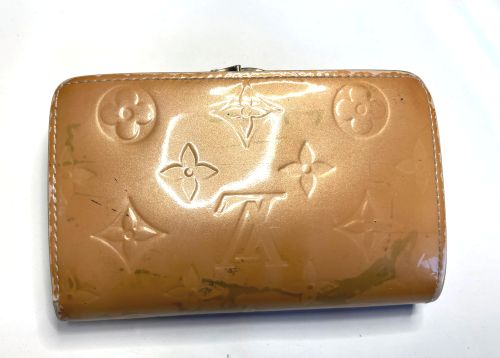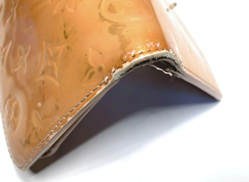 | ヴィトン財布 カラーチェンジ、ほつれ補修 エナメルのカラーチェンジ。艶が落ちる事をご了解の上施工。曲げ部のほつれは内側に 補強の革を入れてから再縫製、コバを仕上げてから表面のみ補色しています。 |