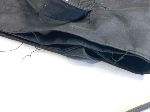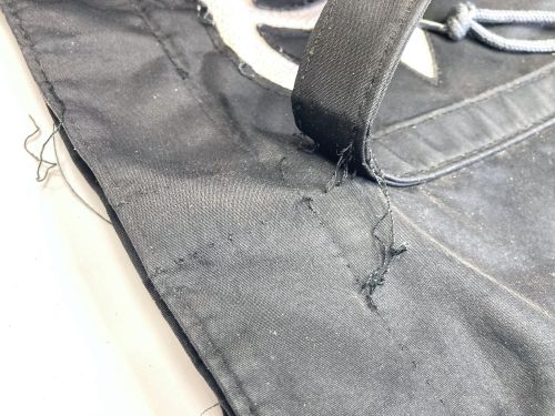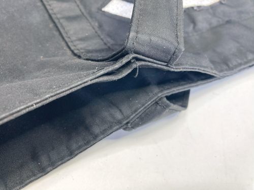 | シャネル 布バック ほつれ補修 持ち手やとば口まわりがほつれていました。布バックですが、ミシンを使わずに手縫い にて仕上げました。また全体的に汚れていたので酸素系洗剤で洗浄しました。 |