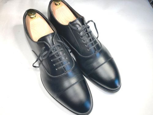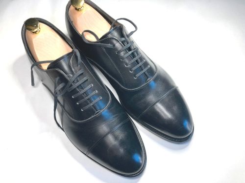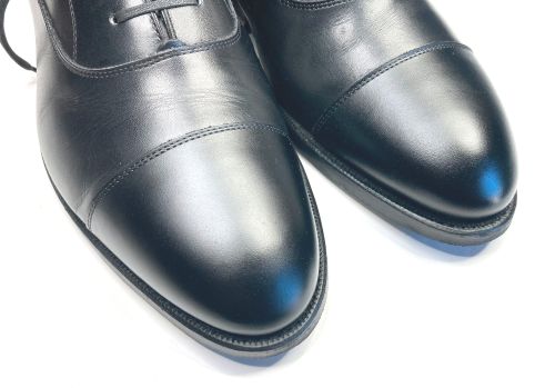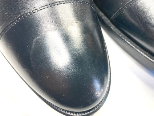 | 紳士靴 つま先補修 つま先の片側がコーティングが剥げたのか?境界が出来ていました。境界の僅かな段差 ですが、このままコーティングをかけて艶を合わせても境界は残ります。出来るだけ コーティングを剥がしてから黒色コーティングをかけてから、最後に艶合わせのクリア コーティングをかけました。 |