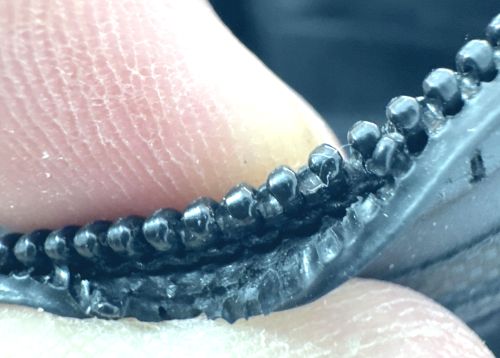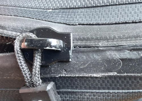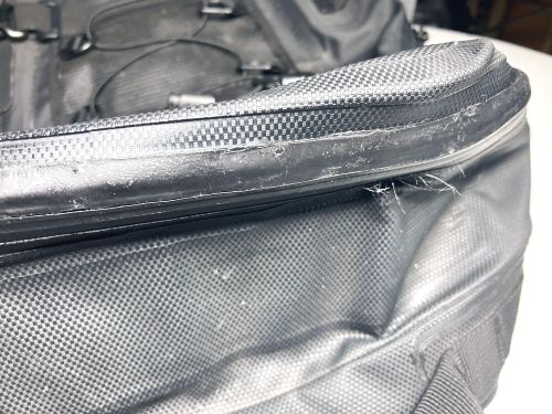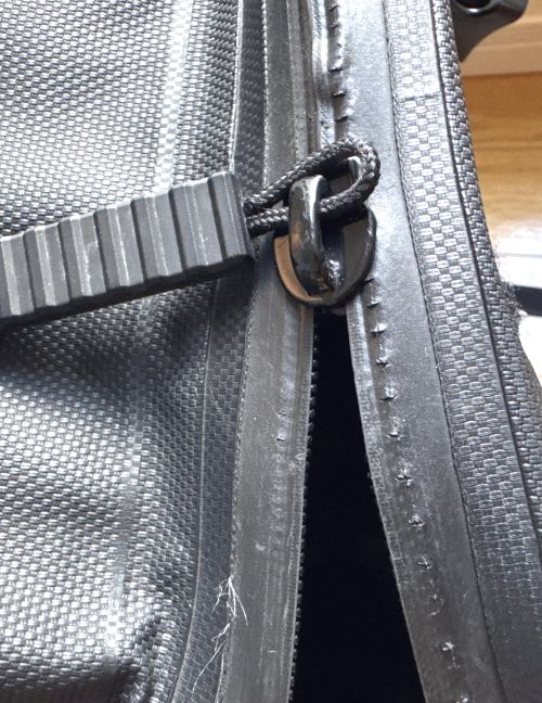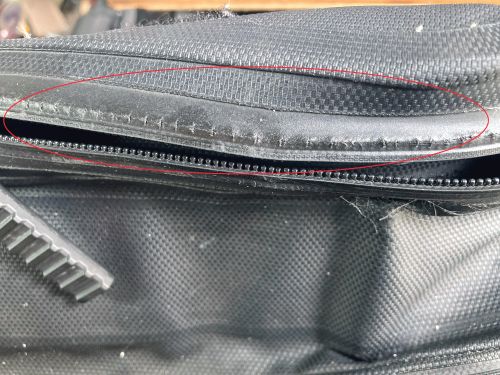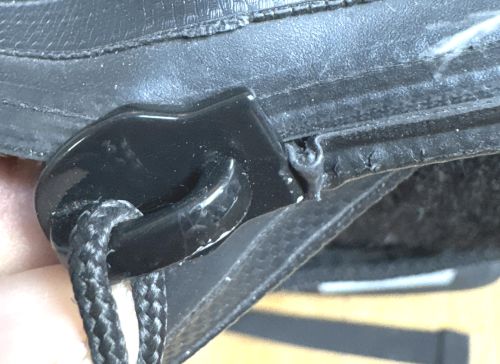 | エンデュリスタン リュック 防水ファスナー補修 防水ファスナーのゴムがスライダーに噛み込んでいました。初期の段階でしたら溝に はめ込んで直りますが、何度もくりかえして板らしく、摩耗してはずれ易くなって いました。外れないように細い糸で縫い込んでから、目立たないようにポリウレタン 接着剤で埋めて面を整えました。その後、表面に油分をぬってからスライダーを動かし 確認しました。。 |