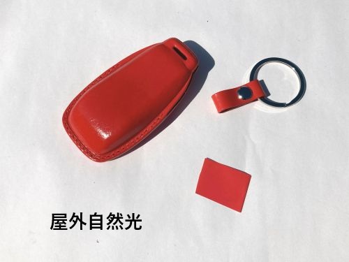 | キーケース 色味補正 サンプルを目標に明るめの赤に補正しました。鮮やかな赤にするために、一旦白で染めて から指定の色を入れていきました。最後に艶ありコーティングをかけています。 |