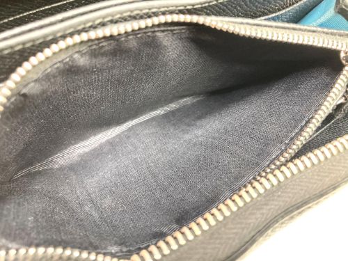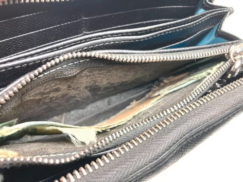 | DEISEL 財布 小銭入れ破れ補修 小銭入れの内張が大きく破れていました。分解して内張を貼り直す方法もありますが 今回は分解せずに上から貼り直す方法にしました。破れた部分を出来るだけ切除して から丈夫なナイロン生地でV字の内張を作って落とし込みファスナーの縫目に沿って縫製 して固定しました。 |