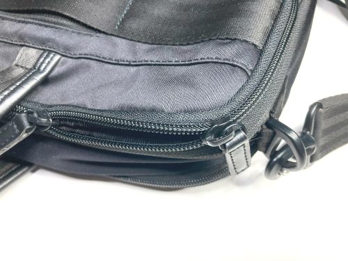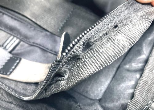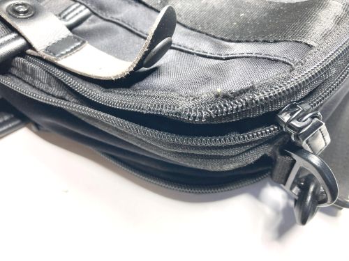 | ブリーフケース ファスナー交換 コイルファスナーの一部が破損して使えない状態でした。この場合ファスナー全体の交換に なります。分解して取り外し新しいファスナーを取付、元通りに組み上げました。スライ ダーは新しいものに交換しましたが、引手は既設のものを移設しました。 |
