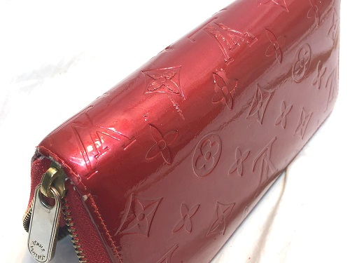 | ヴィトンエナメル財布めくれ補修 エナメル層が部分的に水ぶくれのように浮いてめくれていました。とにかくめくれた際を 固めてから塗膜をつけながら研磨して段差を目立たなくし、最後にコーティングをかけ ました。めくれは収まり見た目も使用許容範囲内に収まったかと思います。 |