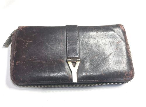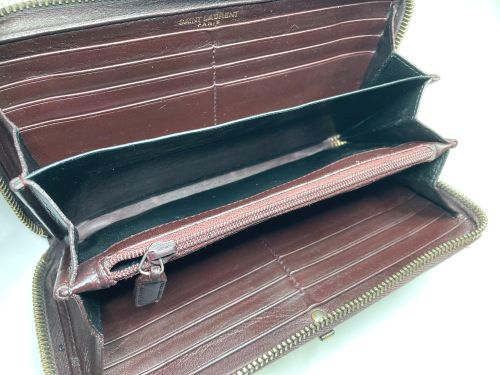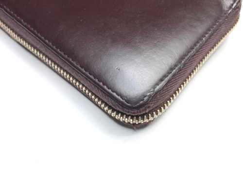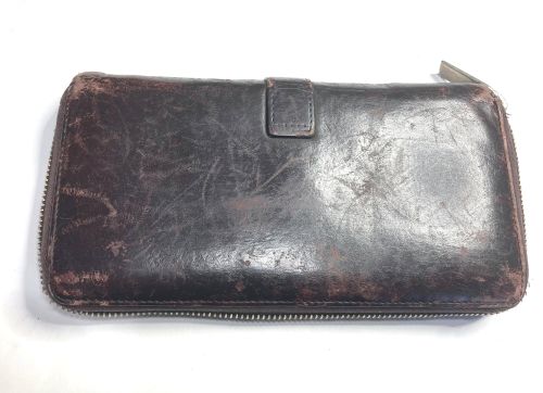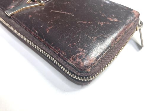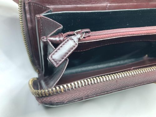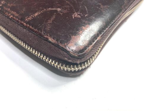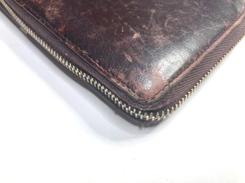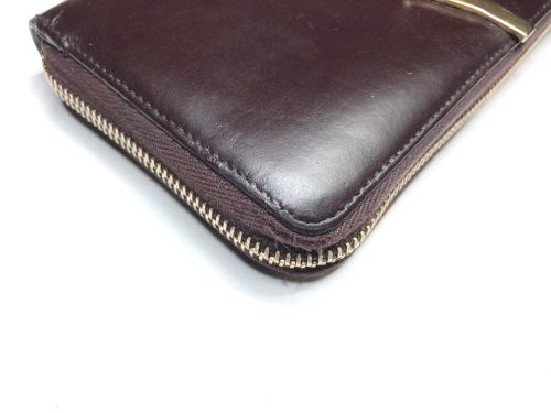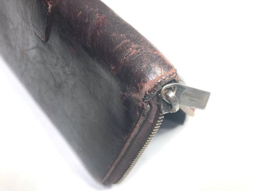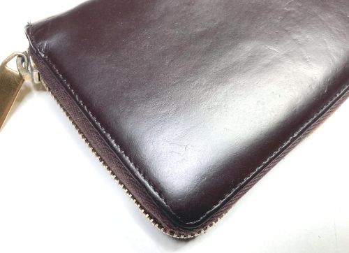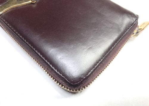 | サンローラン 財布全体補修 全体的に比較的深い擦り傷が無数にありました。曲げ部も縫目から裂けていました。 他に小銭入れ破れもありました。曲げ部は内側に補強用の革を入れ込んで再縫製、コバを仕上げました。背中付近はひび割れも激しく、ここを整えるのが大変でした。傷が目立たなく なるまでひたすら補色、研磨をくりかえして仕上げていきました。小銭入れぼ破れは 分解して丈夫なナイロンに張り替えました。メッキは簡易装置にて仕上げました。 |