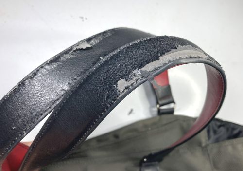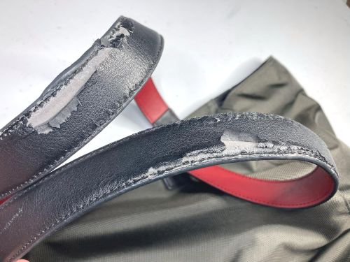 | ランバン 布バック 持ち手 補修 持ち手の表皮の合皮が劣化してめくれていました。当初市販品で対応しようと思いましたが 幅が29mmで規格が合わなかったのと内側赤のものが無かったの途中で表皮のみ本革への 張替えに変更しました。風合いは残して耐久性は格段に上がったと思います。 |