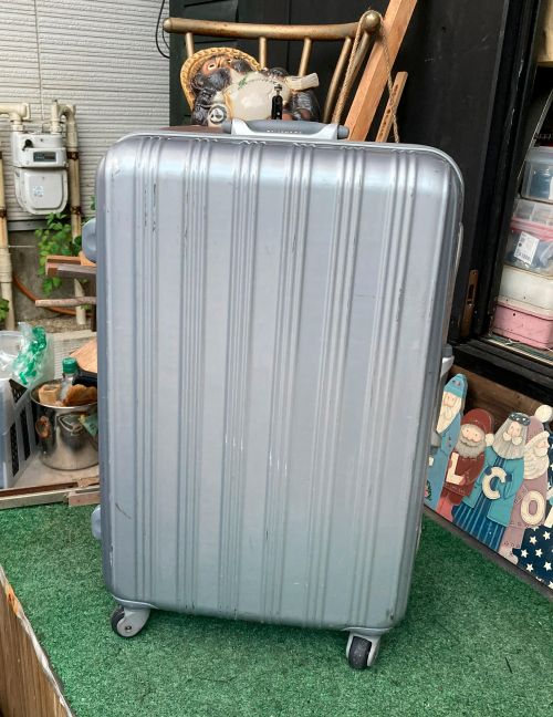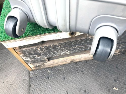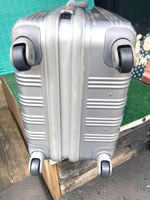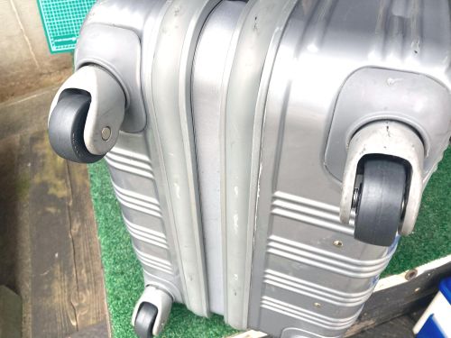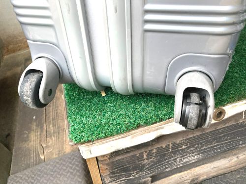 | スーツケースキャスター交換 内袋交換 大型スーツケースキャスターが一部ゴム表皮が剝れていました。車軸を切断して車輪のみ 4輪全て交換しました。車輪幅が24mmでしたので同じ幅の車輪を取り寄せ取り付け ました。 |