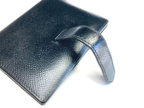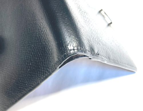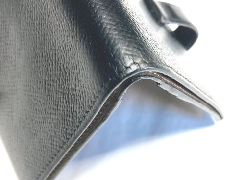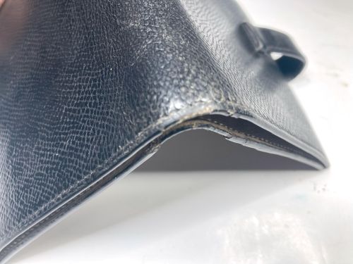 | エルメス財布 色褪せ コバ メッキ補修 全体的な色褪せ、曲げ部を中心としたコバの補修をしました。また、メッキも下地が出る ほど剥げていて、傷が目立たなくなるまで研磨を繰り返し簡易装置でニッケルメッキ かけました。 |