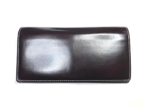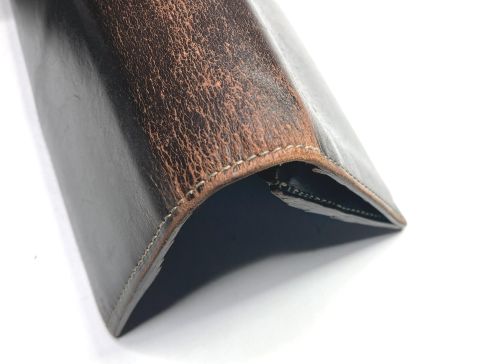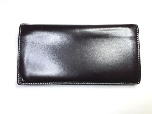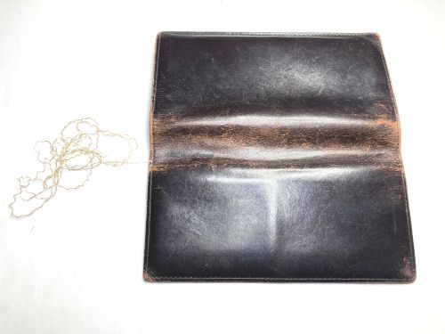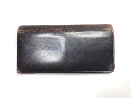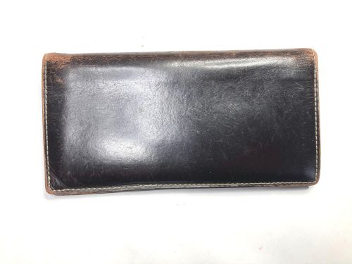 | GANZO 財布 表面補修 表面の曲げ部付近がひび割れて下地が出てガサガサ状態でした。糸目にもかかっていた ので補職する際に糸に色が入るため、一旦糸を抜いてから仕上、最後に新しい糸を入れて 仕上げました。。 |