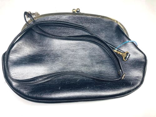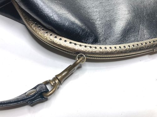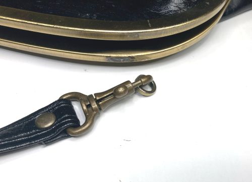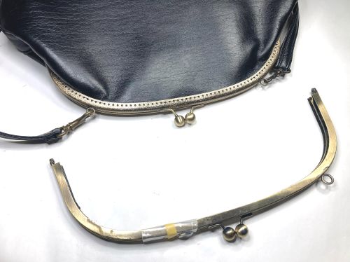 | がま口 財布 口金交換 がま口のつり輪が外れていました。当初板金半田の接合やネジによる固定も考えましたが 見た目や耐久性から考え新しい金具に交換することになりました。しかしながら32cm 幅の大きな口金は入手できなかったので1.5cm小さい金具で本体側を調整して 取り付けました。抜け止めとして紙紐の他、10箇所糸止めをしています。 |