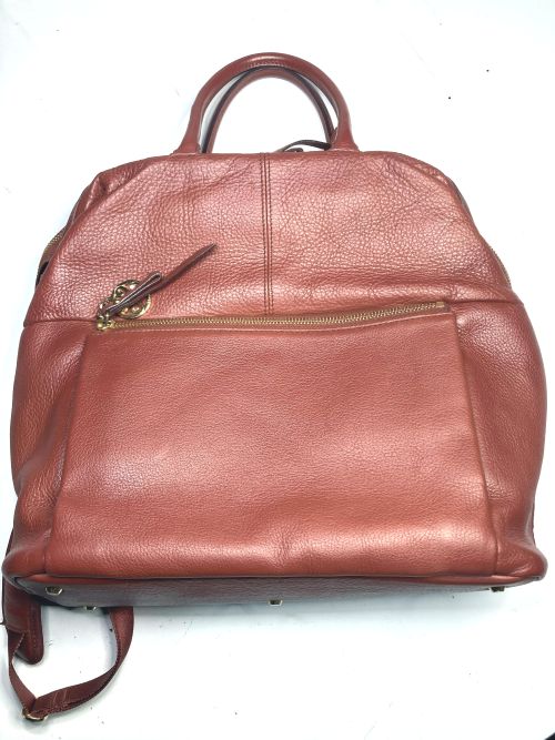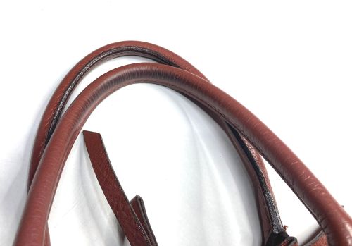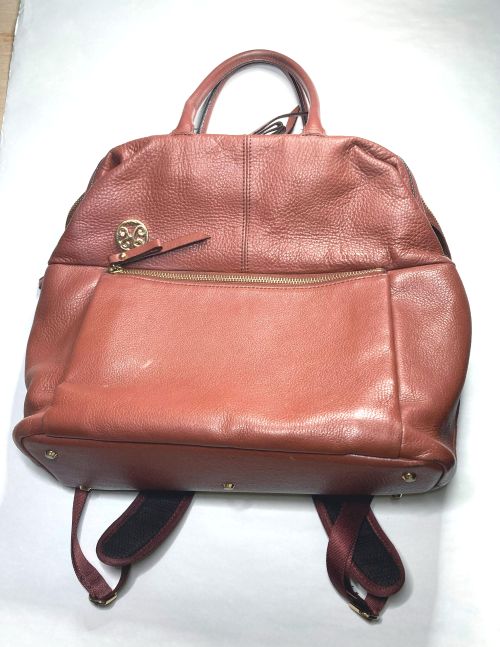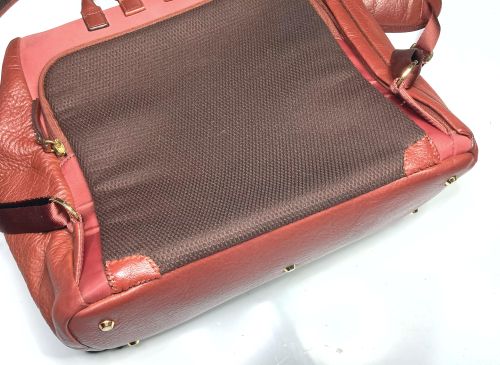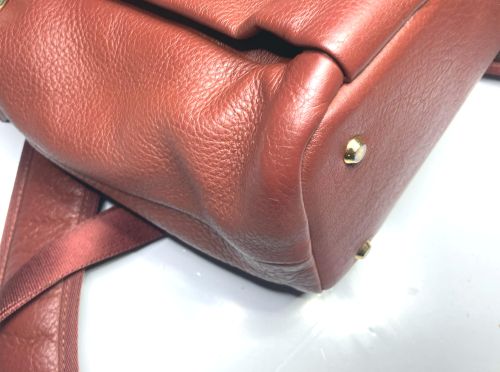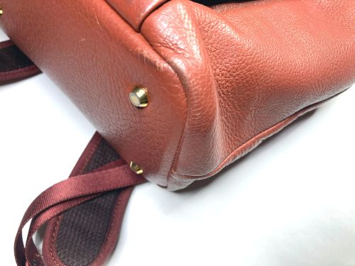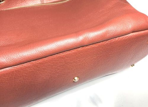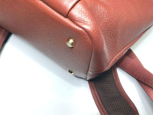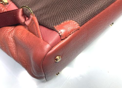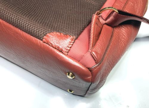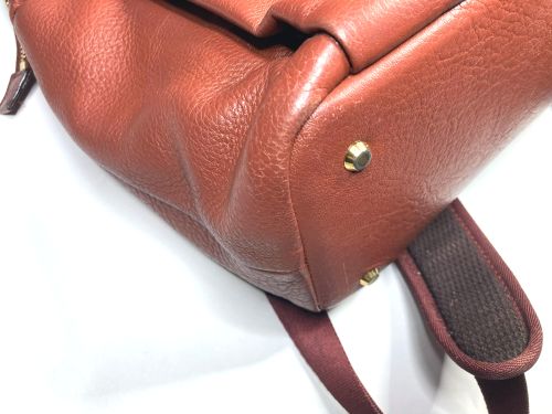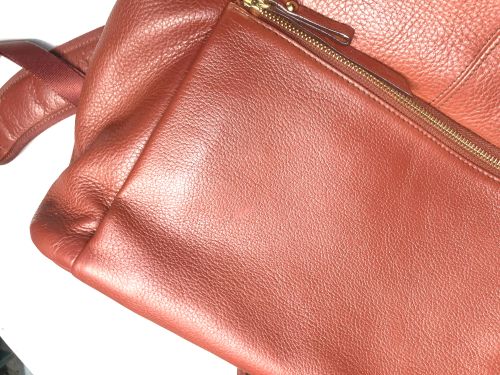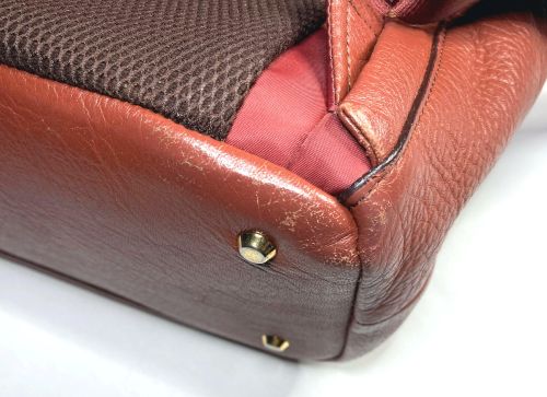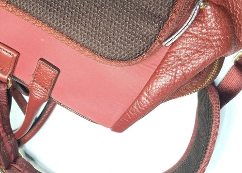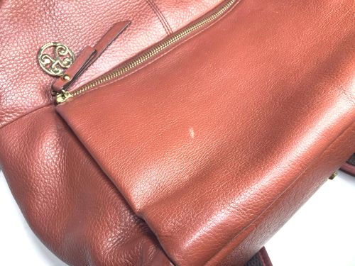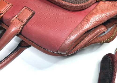 | リュックサック 擦り傷、黒ずみ補修 細かい擦り傷、黒ずみの色補修で比較的全体的に奇麗ですが分部補修ではなく全体補色 としました。また底角が破れていて薄い革を当てて輪郭を縫い付け、見た目のバランスを 考え反対側も同じようにしました。 |