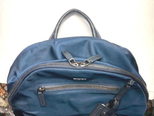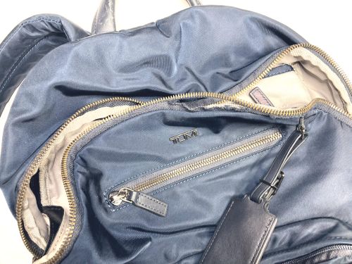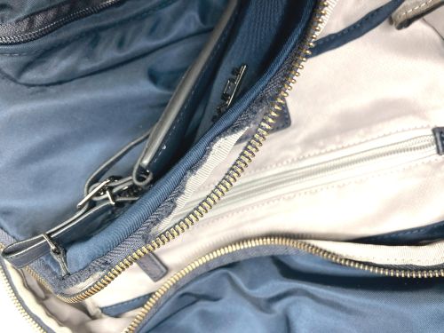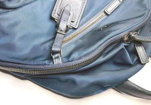 | TUMI リュック ファスナー交換 ファスナーが大きく破れていました。ファスナーテープ(布部)の色はネイビー、 エレメントはブラックメタル、さらに両引きのダブル仕様ですのでYKKから取り寄せ ました。スライダー引手はそのまま移設しました。 |