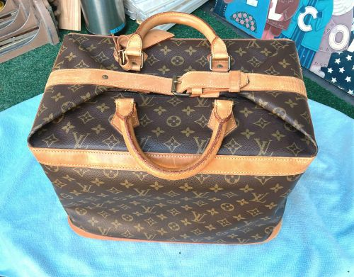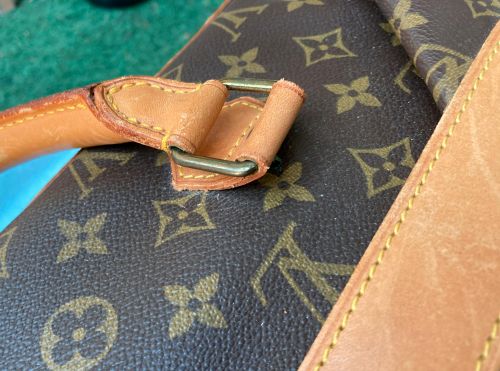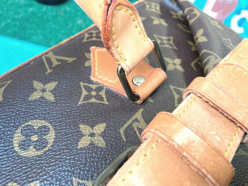 | ヴィトン box型バックカシメ金具修理 カシメ金具がはずれていました。一旦外して金具を磨いてから、サイズの大きい凸側 金具を使って打ち直しました。 |