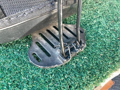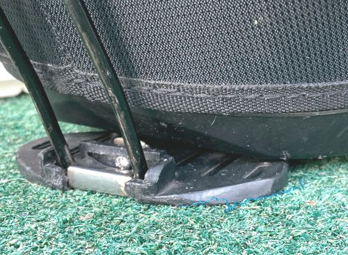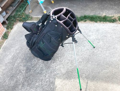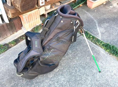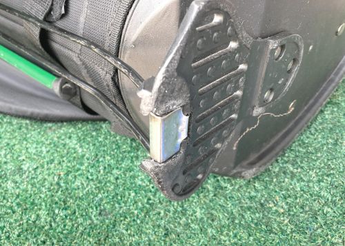 | BOSS キャディバック 修理 開脚式のバックの根元が破損して支柱がはずれていて、針金で大級処置をしていました。 適当な金具を加工して取付ました。 |