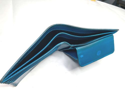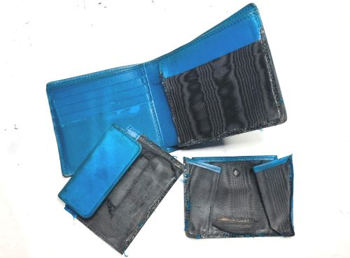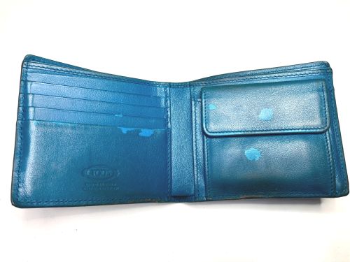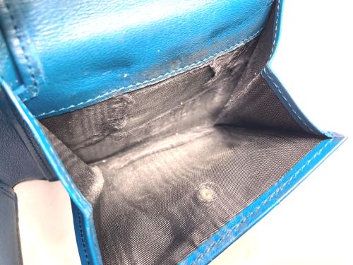 | TODS 財布 小銭入れ、塗膜剥がれ補修 小銭入れの内張が破れていました。分解して丈夫なナイロン生地に張り替えました。また 内側の塗膜が剥がれて指で触るとはっきりわかる程段差が付いていました。上から色を 載せて研磨をくりかえす方法もありますが、かえって塗膜が厚くなりはがれやすいので 小銭入れ側は一旦塗膜を全て剥がしてから補色をしました。最後に組立してコバを仕上 ました。 |