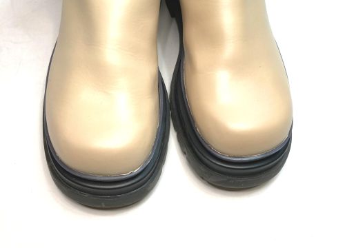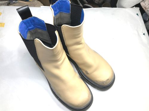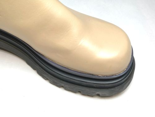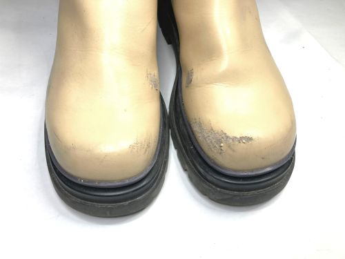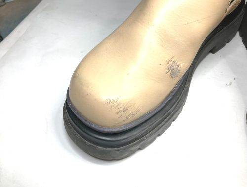 | GREIS ハーフブーツ 擦り傷 つま先内側側面を中心にかなり深い傷がありました。柔らか目の充填剤で傷を埋めてから 境界を目立たなくするため補色と研磨をひたすら続け、最後に全体を補色しました。 |