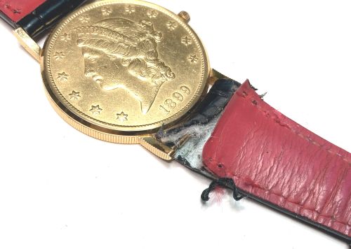 | 腕時計 ベルト 補修 ベルトの付け根がちぎれかかっていました。分解すると中の芯材がちぎれていたので 交換してから再縫製コバを仕上ました。 |
